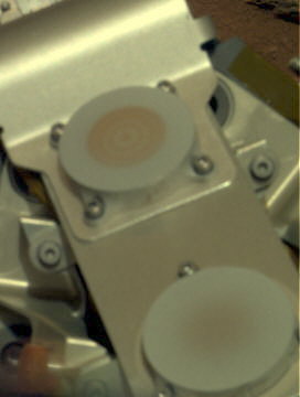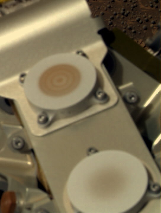 the 3.1 millimeter-deep (just over one-tenth of an inch) hole ground by the Mars Exploration Rover Opportunity's rock abrasion tool in the target called "Mojo 2" on "Flatrock" was taken on the 44th martian day, or sol, of the mission. It will help complete the chemical analysis of the lowest layer of the outcrop in the crater where the rover now resides. After a brief brushing on sol 45, the science team plans to place Opportunity's spectrometers on the hole to collect data vital to their understanding of this impressive outcrop.