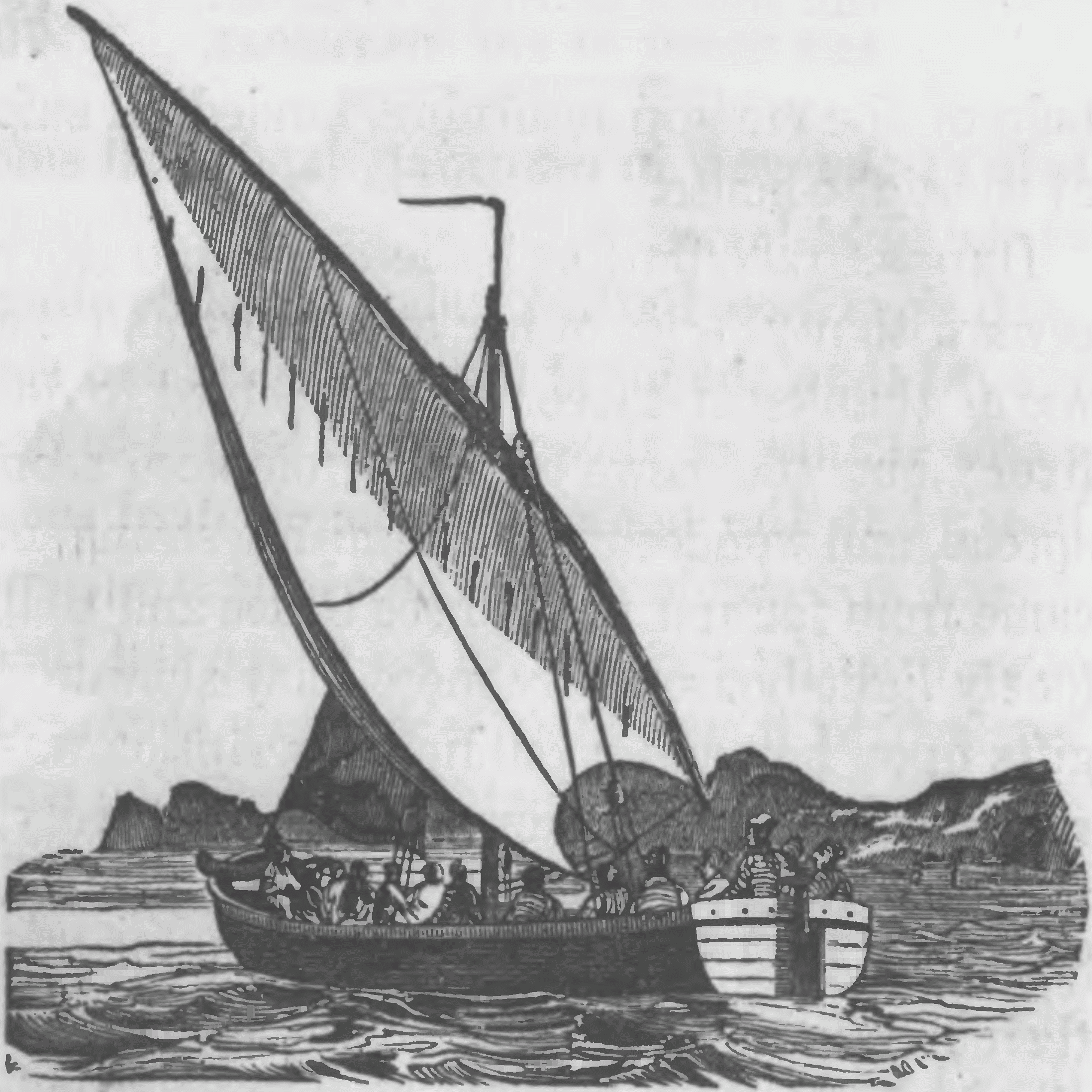 A number of these boats once made towards a whale, which, with her calf was playing round a group of rocks. The old whale perceiving the approaching danger, did all she could to warn her little one of it, till the sight became quite affecting. She led it away from the boats, swam round it, embraced it with her fins, and sometimes rolled over with it in the waves.