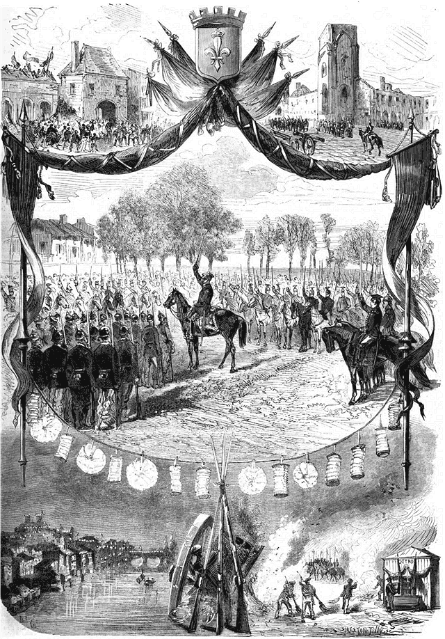 A huit heures, le commandant en chef de l'armée d'occupation arriva à cheval, suivi de son état-major. Après avoir passé dans les rangs, il se plaça devant les troupes. Brusquement il tira son sabre du fourreau, et poussa trois hourrahs auxquels les troupes répondirent.