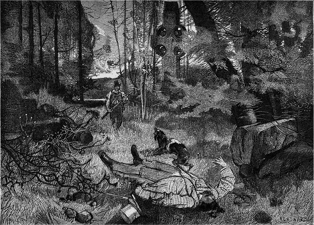 La scène que représente aujourd'hui notre dessin, c'est l'odieux dans le tragique. Qu'a fait ce malheureux que les Prussiens vont passer par les armes? Obsédé par le souvenir de la patrie vaincue et foulée aux pieds, révolté des outrages qu'à chaque heure du jour lui font subir d'indignes vainqueurs experts en l'art de tuer à petit feu et à petits coups, il a tenté de s'évader. Surpris dans sa tentative et maltraité, il s'est défendu. Aussi va-t-il mourir; mais c'est debout, la tête haute, en écrasant sous le mépris de son regard ses ignobles vainqueurs, qu'il subira la mort. Il ne se plaint pas, il ne réclame pas. Un Français n'a rien à demander à un Prussien. Même vaincu, même en mourant, il reste encore son maître et lui fait la leçon. Sang ou argent, en effet, quelle que soit sa dette, il ne mendie pas de remise, lui, il paie!