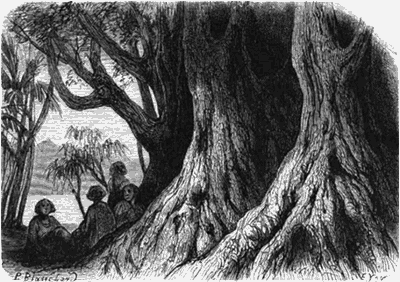 La tribu des Taïoas habite cet Eden; des cases éparpillées sous bois dépendent d'un chef admirablement tatoué et d'une rare beauté, qui nous fit lui-même les honneurs de son district, et se constitua le guide de nos excursions.