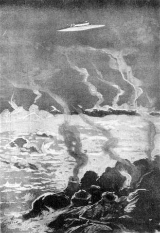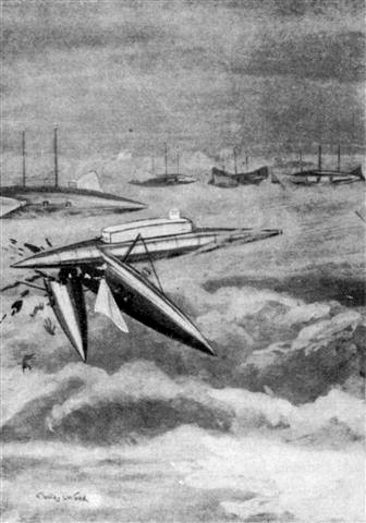Within the distance of about a mile it swung round at right angles to the steamer's course with a rapidity which plainly showed that it was entirely obedient to the control of a guiding intelligence, and hundreds of eager eyes on board the liner saw, sweeping down from the grey-blue of the early morning sky, a vessel whose hull seemed to be constructed of some metal which shone with a pale, steely lustre.