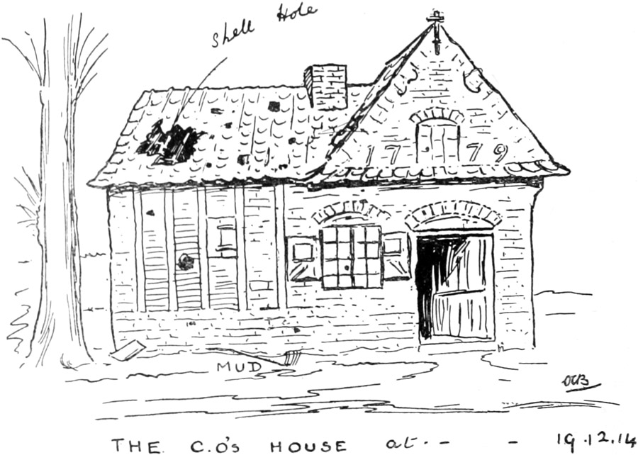 Well, I have not been able to write to you before this, as I try to do every day. Yesterday, for instance, I was up at 5 o'clock, and after an hour's parade, shivering in the dark, I then went off to another, and got back about 1 o'clock. I was instructing my men in the difference between English and French distances—i.e., what 600 yards looked like in this country for rifle ranges, and where an enemy was likely to hide, etc. In the middle of this the Brigade Major dashed up in despair, as some order of his had gone astray. I was wanted to take ten officers at once and to jump into a motor lorry, and go with a party of 30 others to the trenches. I popped my ten officers in, and went off with the Brigade-Major's greatcoat in my hurry! We raced our lorry through country looking just like the Romney Marshes, Sussex. As we went we met refugees flying from a burning town which had been set on fire by German shells. We also passed immense amounts of transports; for troops must live even when they fight. On the way I suddenly saw the back of my last General at D——. You remember him—a very pleasant man. Well, he showed us round the trenches. The shells were bursting up along the forward line held by my brother Hal's[3] [7]old regiment [4th King's Own]. You could see the shrapnel bursting on the ground, and perhaps setting fire to something or other. None of the shells were near us, so we were quite safe. Leaving the line about dark, we had to rattle home. Of course we lost our way, as our maps are on such a small scale, and the inhabitants of one little town told us the wrong direction, mistaking our French, I suppose! But we were not to be done, for we picked up an old lady trotting along in the dark, and, having satisfied her that we were not Germans, she soon showed us the road, coming a couple of miles with us. I arrived home—or, rather, at my billet—shivering about 7.30 p.m., having had heavy cold rain during a great part of the day. I turned out to an "Alarm" Parade at 9 o'clock, returning to my house again at 10 p.m. So, you see, I am not eating the bread of idleness! To-day we have all been out and got very wet. It is unpleasant, but one cannot help it in war. I have had very hard work with my returns, and my Quartermaster is getting old. However, I shall rub along now, I trust! To-morrow I am sending my R.C. soldiers to a church with holes in the roof from shells. Don't you think I really deserve well of my Catholic acquaintances, for I have had the priest down twice to see them. Our host tells me that the Germans came here; the people ran away, and that the Germans ran after them, caught eleven, made them dig a big hole in a field, and then shot them. I wonder if it is true. Certainly I have seen some few graves in the fields with no names, just little crosses of rough wood. They may be murdered inhabitants, or they may be simply skirmishers who fell in some inglorious scrap. Please send me a few more packets of plain envelopes; one bundle at a time is quite enough, as I write on this note-book paper; it reduces the amount I have to carry. Some men have been sent to me to be instructed in Machine Guns. What a curious nation we are, training our men quite happily within ten miles of the enemy! I think I told you about our billets in the last letter. The Germans emptied the wine cellar. Imagine an English farm having a wine cellar at all! We do not even burn the wood, and we have done a great trade for these people in milk and butter. Eggs there appear to be none. I expect we shall be moving shortly; but where to I cannot tell. I was glad to find that the French had not at all exhausted their reserves. For instance, there is in the house here a labourer who is a cavalry soldier. He is 43 years of age, and his category is the next to go. Only your first letters have reached me up to now, but some more are expected in to-morrow evening. The General I met yesterday told me that the Prussian [8]Guards, 15,000 strong, were formed up two nights ago, and were told that they must break through our lines, as their Infantry of the Line had made an attempt to do so and had failed. They tried hard; we heard the guns going. They did not get through, and they showed no disposition to try again yesterday morning, fortunately. It is probable that they suffered very severely. If this goes on, they must stop shortly. Possibly you know more about it all than I do, though, as I have seen no papers; in fact, I am absolutely isolated. It has been raining in torrents, but has now stopped for a minute, and the wind is getting up. Horrid in the trenches, I fancy. Our Protestant soldiers open their eyes at the crucifixes scattered all about the country. I have three in the tiny room which I share with Major B——. My doctor is ill, which is a nuisance. I have not yet heard what the Government gave me for my horse "Goldfinch."