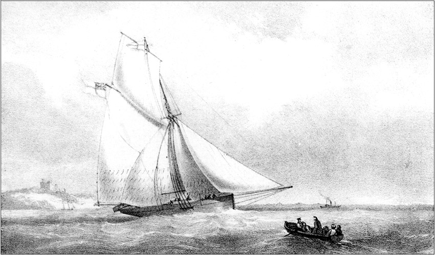 The "Iris" cutter belongs to the R.Y.S., and is the sister-vessel of the "Corsair." She was built by Ratsey for the late Mr. Fleming, with whom she was a great favourite, and for whom she won many valuable prizes. From England to the Mediterranean, she safely bore her first master many times; but with flowing canvass and with rapid keel at last enticed him once too often from his native shore; for, during [Pg 3]a cruise in the Mediterranean, after many months of pain, he died while gazing on her. Passing through several hands, serving all equally well in gale or calm, she came at last into the possession of Lord R——, who has travelled farther, and made more extraordinary voyages in her than any member of the Squadron; and in spite of all improvements adopted of late years in yacht-building, there are but few, if any, vessels of seventy-five tons, that can surpass her in speed and symmetrical beauty, or in the buoyant ease with which she has encountered the fiercest storms.