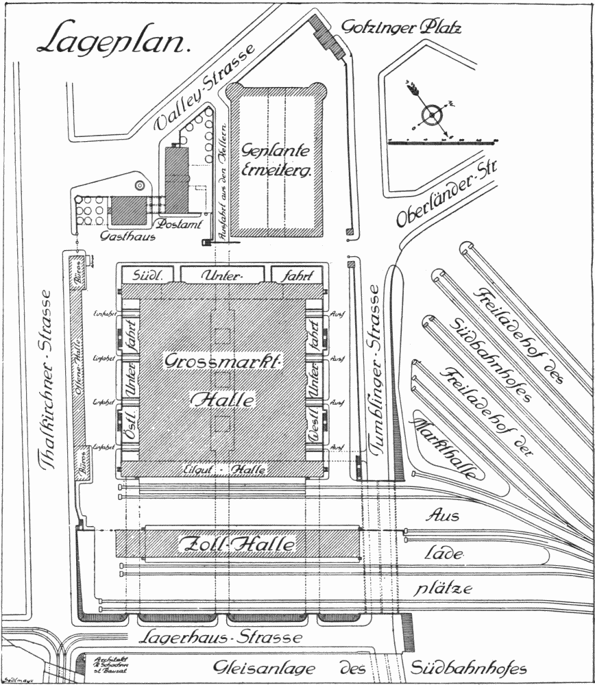 There is an inclined road by the tree in the center of the picture, leading to the special railroad freight depot. Cars are also run directly under the market and their cargoes are delivered by hydraulic lifts to the stands above.