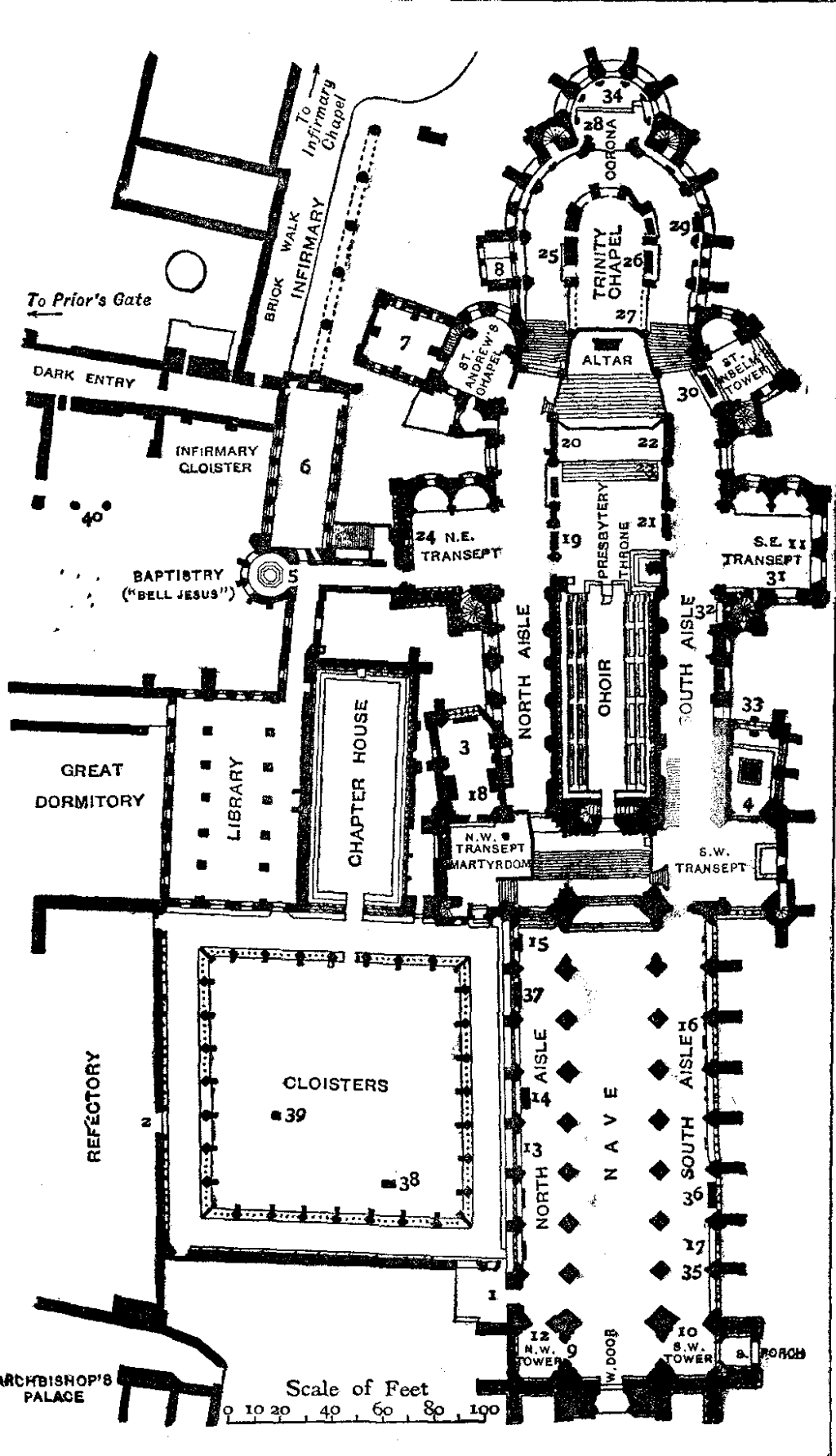 This splendid church, representing the finest achievement of Norman master-builders and workmen, rising high above the domestic quarters of the monastery and standing forth conspicuously from every part of the little walled city, then consisting, to a considerable extent, of low wooden houses, had now reached the stage in its development when it was to be the scene of the murder which was to make Canterbury the most famous resort of pilgrims in Europe. This occurred forty years later; but no change in the great Norman church had taken place in that period.