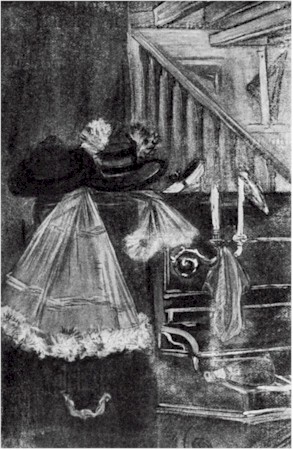 “Merci, monsieur—merci!” and she secretes the package in her netted reticule, and hobbles out into the sunny street, while the patron attends to the wants of three draymen who have clambered down from their heavy carts for a friendly chat and a little vermouth. A polished zinc bar runs the length of the low-ceilinged room; a narrow, winding stairway in one corner leads to the living apartments above. Behind the- 16 - bar shine three well-polished square mirrors, and ranged in front of these, each in its zinc rack, are the favorite beverages of the Quarter—anisette, absinthe, menthe, grenadine—each in zinc-stoppered bottles, like the ones in the barber-shops.