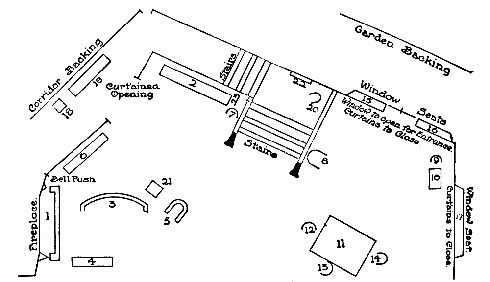 A plan of the stage of the New Theatre, London, set for the play is given at the end of the book.{*}