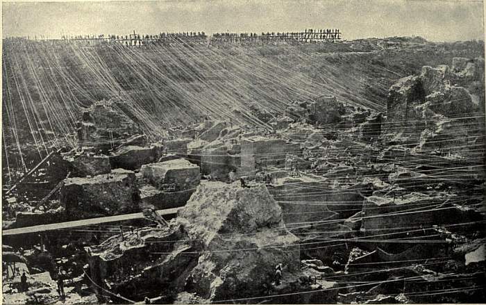 The scene of native mining was now transferred from the open pit to underground tunnels; the vast network of wire ropes (Plate II. fig. 12) with their ascending and descending buckets disappeared, and with it the cosmopolitan crowd of busy miners working like ants at the bottom of the pit. In place of all this, the visitor to Kimberley encounters at the edge of the town only a huge crater, silent and apparently deserted, with no visible sign of the great mining operations which are conducted nearly half a mile below the surface. The aspect of the Kimberley pit in 1906 is shown in fig. 13 of Plate II., which may be compared with the section of fig. 8.