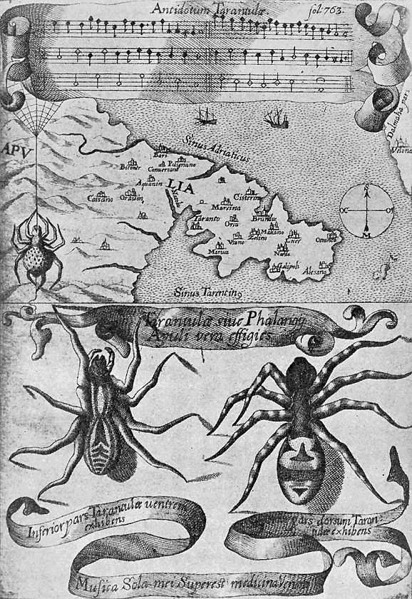 and the music prescribed as an antidote for the poison of its bite. (1643). Some early medical entomology. Athanasius Kircher's illustration of the Italian tarantula and the music prescribed as an antidote for the poison of its bite. (1643).