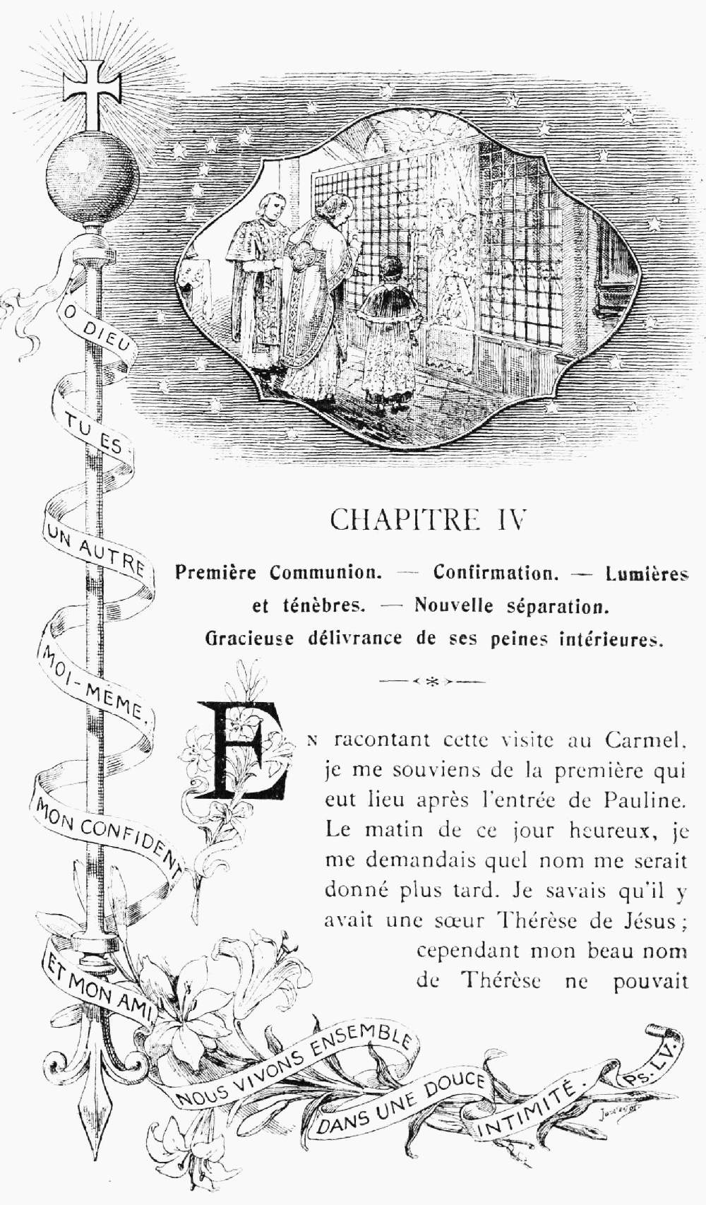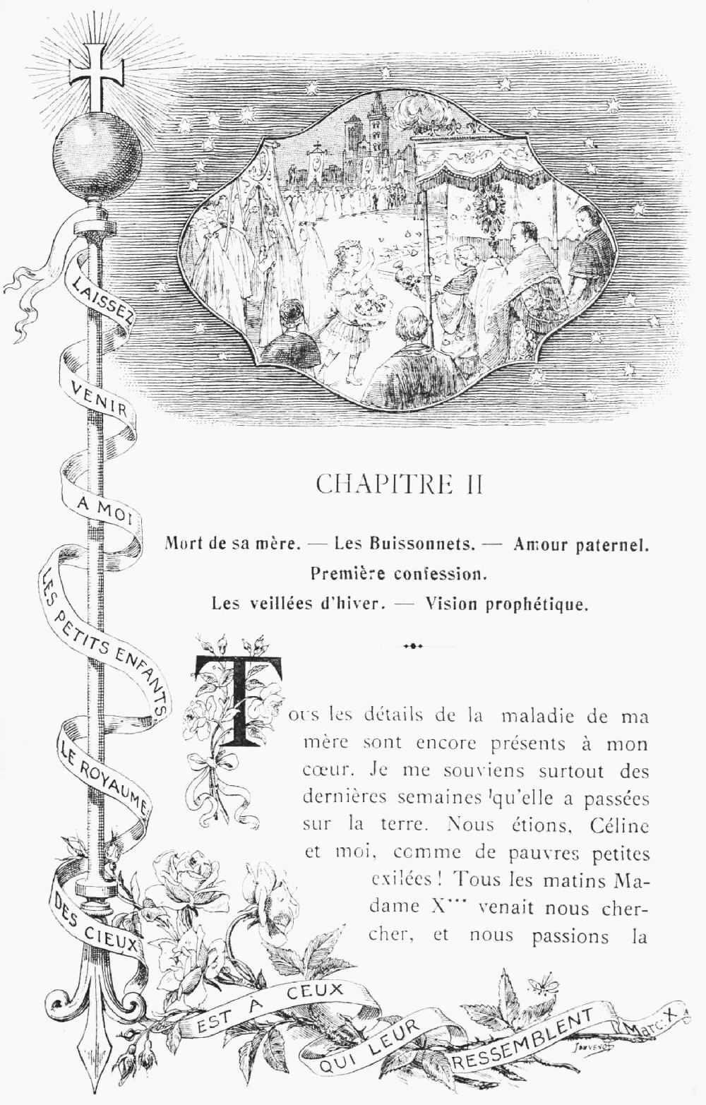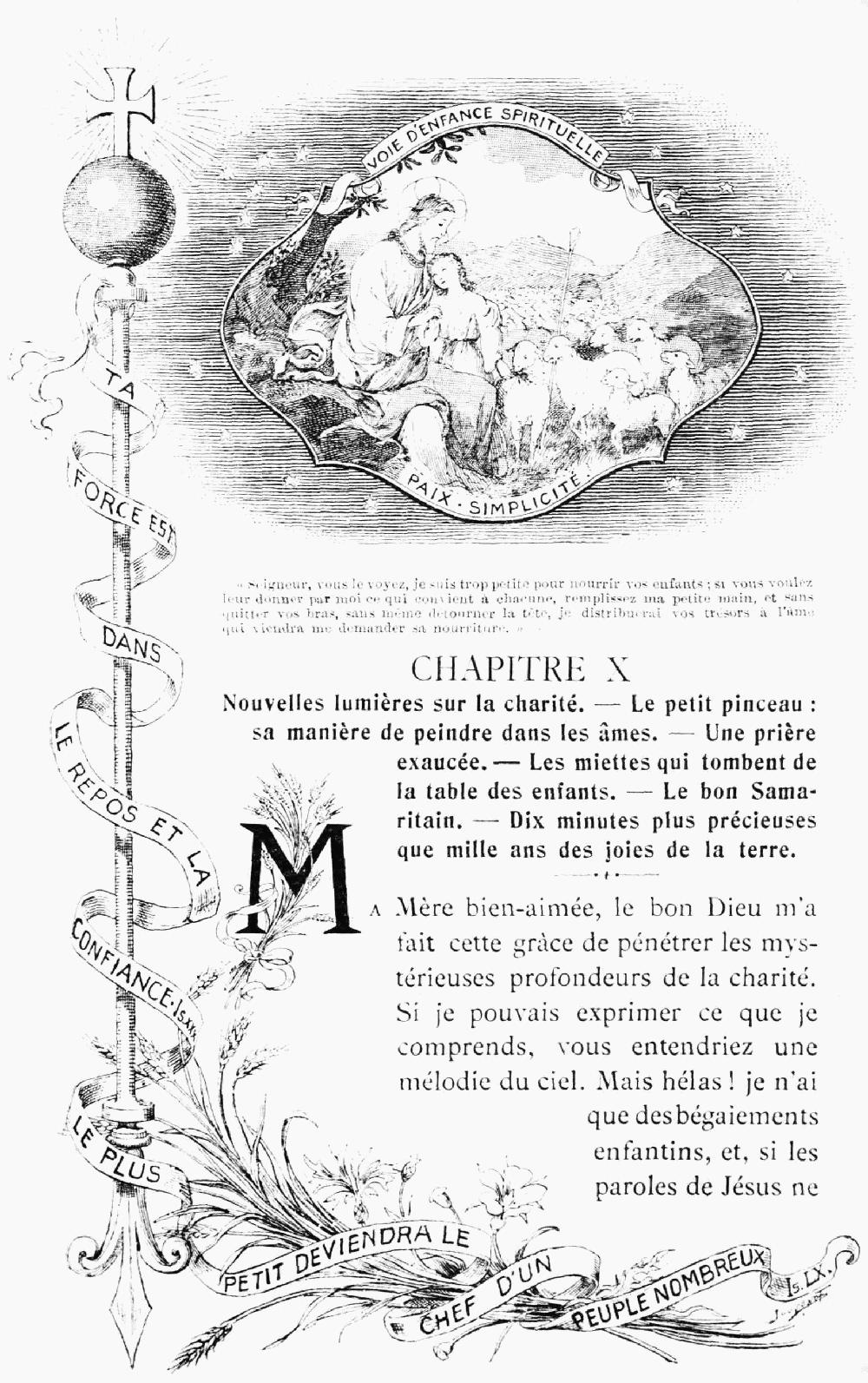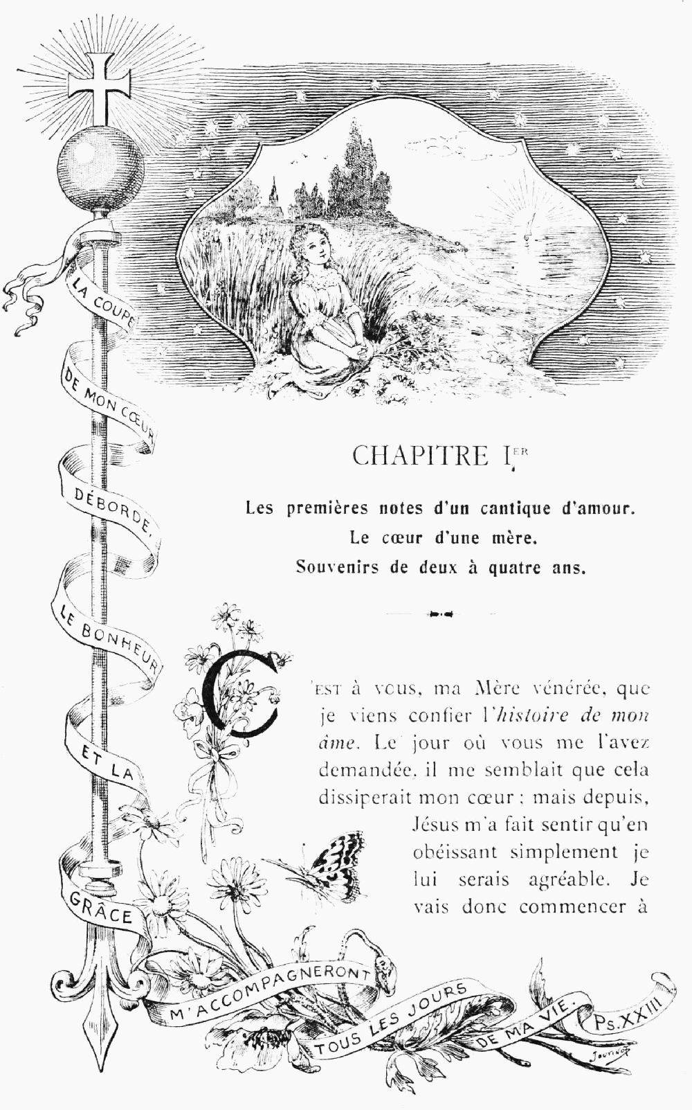 Vous vous êtes sans doute souvenue de cette parole lorsque vous avez résolu de donner au public l'Histoire d'une ame. Dépositaire des secrets intimes de votre fille bien-aimée, Sœur Thérèse de l'Enfant-Jésus, vous n'avez pas cru devoir garder pour vous seule et pour vos Sœurs ce qu'elle n'avait écrit que pour vous. Vous avez pensé, et de bons juges avec vous, qu'il serait glorieux à Notre-Seigneur de faire connaître les opérations merveilleuses de sa grâce dans cette âme si pure et si généreuse.