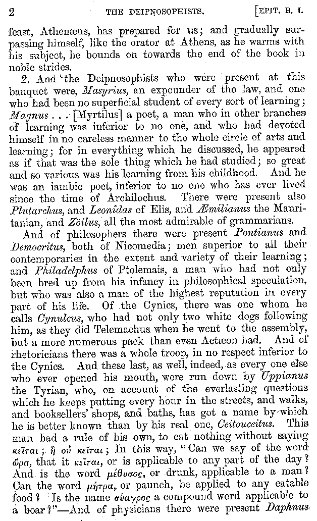 2. And the Deipnosophists who were present at this banquet were, Masyrius, an expounder of the law, and one who had been no superficial student of every sort of learning; Magnus . . . [Myrtilus] a poet; a man who in other branches of learning was inferior to no one, and who had devoted himself in no careless manner to the whole circle of arts and learning; for in everything which he discussed, he appeared as if that was the sole thing which he had studied; so great and so various was his learning from his childhood. And he was an iambic poet, inferior to no one who has ever lived since the time of Archilochus. There were present also Plutarchus, and Leonidas of Elis, and Æmilianus the Mauritanian, and Zöilus, all the most admirable of grammarians.