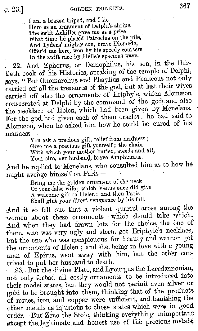 | Banquets—Baths—Banquets—The Banquets described by Homer—Banquets—The Palaces of Homer's Kings—Conversation at Banquets—Customs in Homer's Time—Attitudes of Guests—Feast given by Antiochus—Extravagance of Antiochus—Ptolemy Philadelphus—Procession of Ptolemy Philadelphus—A large Ship built by Ptolemy—The Ship of Ptolemy Philopator—Hiero's Ship—Banquet given by Alexander—Athenio—The Valour of Socrates—Plato's account of Socrates—Socrates—The Gorgons | 287-352 |