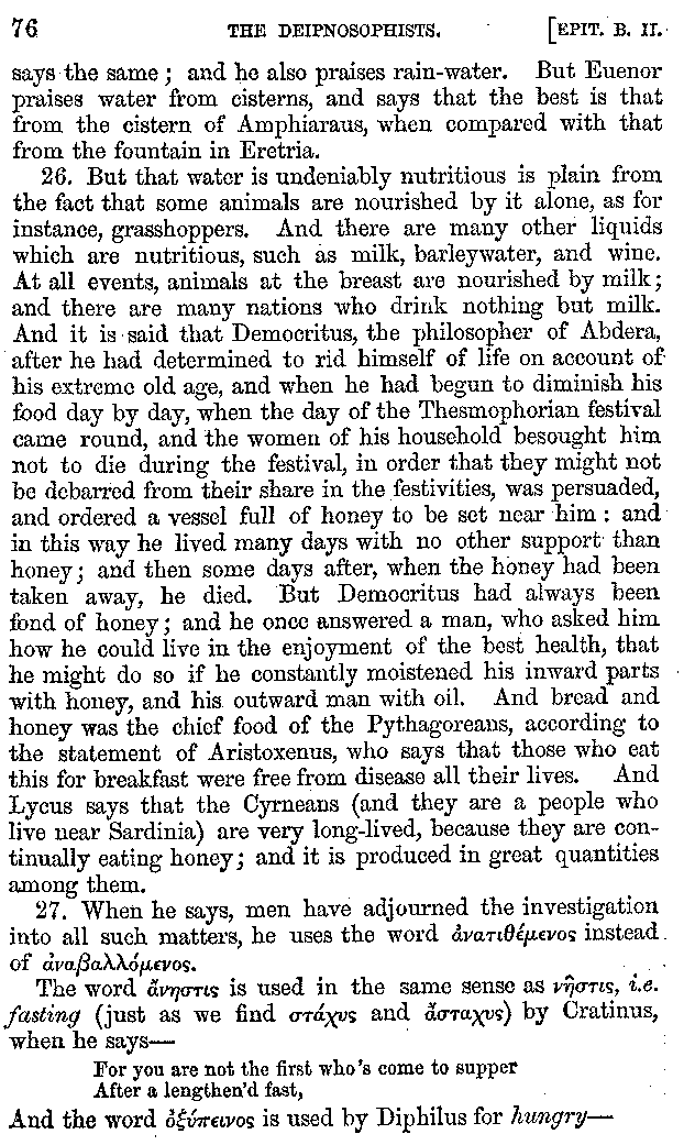 12. About the time of Tiberius there lived a man named Apicius; very rich and luxurious; from whom several kinds of cheesecakes are called Apician. He spent myriads of drachms on his belly, living chiefly at Minturnæ, a city of Campania, eating very expensive crawfish, which are found in that place superior in size to those of Smyrna, or even to the crabs of Alexandria. Hearing too that they were very large in Africa, he sailed thither, without waiting a single day, and suffered exceedingly on his voyage. But when he came near the place, before he disembarked from the ship, (for his arrival made a great noise among the Africans,) the fishermen came alongside in their boats and brought him some very fine crawfish; and he, when he saw them, asked if they had any finer; and when they said that there were none finer than those which they brought, he, recollecting those at Minturnæ, ordered the master of the ship to sail back the same way into Italy, without going near the land. But Aristoxenus, [11]the philosopher of Cyrene, a real devotee of the philosophy of his country, (from whom, hams cured in a particular way are called Aristoxeni,) out of his prodigious luxury used to syringe the lettuces which grew in his garden with mead in the evening, and then, when he picked them in the morning, he would say that he was eating green cheesecakes, which were sent up to him by the Earth.