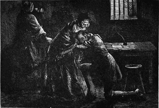 He raised his manacled hands in a threatening attitude, fixed his eyes on his shrinking