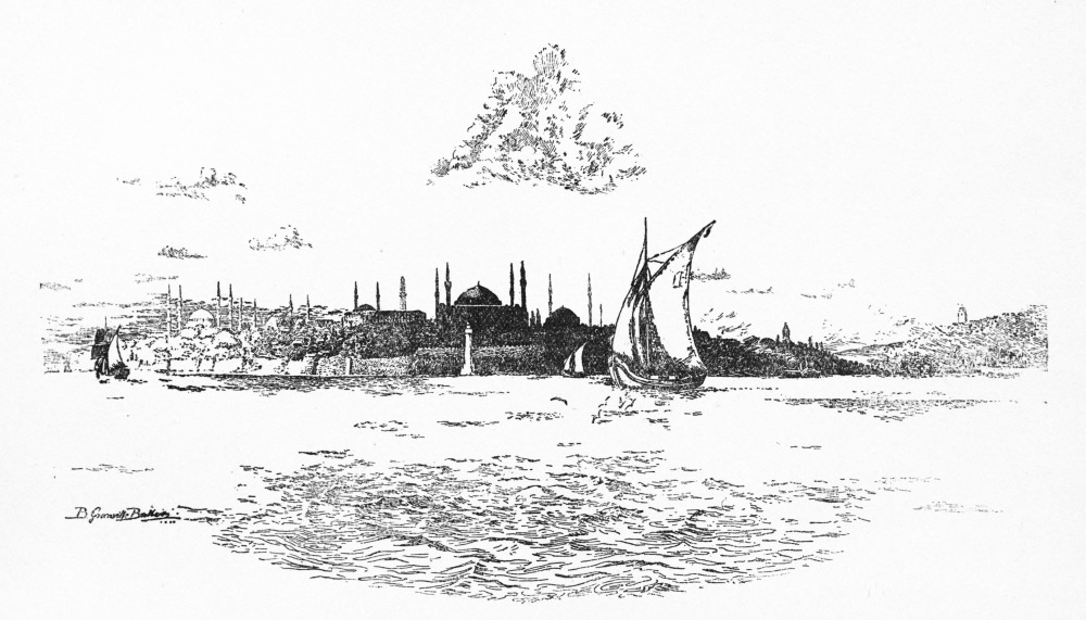 And travelling toward his Eastern goal the reader passes through many an ancient city whose walls chronicle the history of its inhabitants. He should take his journey easily, should move eastward with no undue haste. Let him go down the Danube, that mighty river which arises from a small opening in the courtyard of a German castle, flows majestically through the lands of many nations, where before the days of history Saga held her sway and gave birth to the Nibelungs. In its waters many ruined castles are reflected, amongst others Dürnstein, where Blondel’s voice at length brought hope of deliverance to his imprisoned liege, Richard Cœur-de-Lion. He will pass many fair historic cities, Vienna, Budapesth, Belgrade, the White Fortress, and so on through the Iron Gates, whence the great stream swells with increasing volume through the plains of Eastern Europe to throw out many arms to the Black Sea. It is here that Author and Artist await you; for to worthily approach Constantinople you should do so from the north, and by sea. And you are in good company, for by this seaway came the Russians in their several attempts on the Eastern capital. The Turks, too, the present masters of the situation, found this way and followed it to victory. These, too, overcame great difficulties—they sailed in small vessels and were much at the mercy of wind and weather; in fact, the Russians found their plans frustrated by the elements. They met with anything but a pleasant reception, whereas the traveller nowadays steams in great comfort in a racy-looking Roumanian