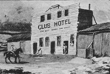 As recreation we used to play occasional games of cricket on a very hard and uneven pitch, and for social entertainments had frequent sing-songs and “buck dances”—that is, dances in which there were no ladies to take part—at Faahan's Club Hotel in the town, some one and a half miles distant. “Hotel” was rather too high-class a name, for it was by no means an imposing structure, hessian and corrugated iron taking the place of the bricks and slates of a more civilised building. The addition of a weather-board front, which was subsequently erected, greatly enhanced its attractions. Mr. Faahan can boast of having had the first two-storeyed house in the town; though the too critical might hold that the upper one, being merely a sham, could not be counted as dwelling-room. There was no sham, however, about the festive character of those evening entertainments.