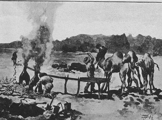 The monotony of the flat timber-clad country was occasionally relieved by the occurrence of large isolated hills of bare granite. But for these the road, except for camels, could never have been kept open; for they represented our sources of water supply. On the surface of the rocks numerous holes and indentations are found, which after rain, hold water, and besides these, around the foot of the outcrops, “soaks,” or shallow wells, are to be found.