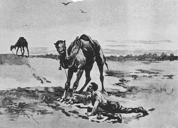Poor Crossman (since dead), McCulloch, and I were mates, and we were well off, for we had not only “Little Carnegie,” and who, like his master, had been earning his living at Bayley's, but a camel, “Bungo” by name, kindly lent by Gordon Lyon. Thus we were able to carry water as well as provisions, and helped to relieve the sufferings of many a poor wretch who had only his feet to serve him.