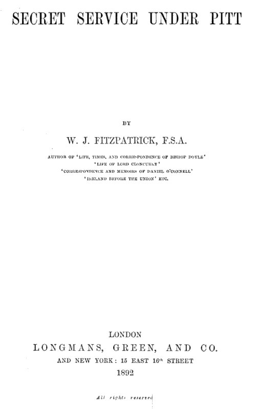 A word as regards some of the later sources of my information. The Pelham MSS. were not accessible when Mr. Froude wrote. Thomas Pelham, second Earl of Chichester, was Irish Secretary from 1795 to 1798, but his correspondence until 1826 deals largely with Ireland, and I have read as much of it as would load a float. Another mine was found in the papers, ranging from 1795 to 1805, which filled two iron-clamped chests in Dublin Castle, guarded with the Government[Pg vii] seal and bearing the words 'Secret and Confidential: Not to be Opened.' These chests were for a long time familiar objects exteriorly, and when it was at last permitted to disturb the rust of lock and hinge, peculiar interest attended the exploration. Among the contents were 136 letters from Francis Higgins, substantially supporting all that I had ventured to say twenty years before in the book which claimed to portray his career. But neither the Pelham Papers in London nor the archives at Dublin Castle reveal the great secret to which Mr. Froude points.