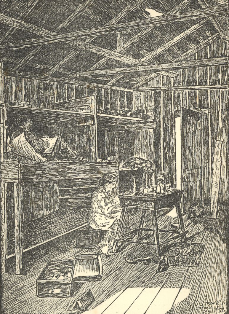The Frisby House, for that was the name of the hotel, was a place of fallen fortunes, like the town. It was now given up to labourers, and partly ruinous. At dinner there was the ordinary display of what is called in the west a two-bit house: the tablecloth checked red and white, the plague of flies, the wire hencoops over the dishes, the great variety and invariable vileness of the food and the rough coatless men devoting it in silence. In our bedroom, the stove would not burn, though it would smoke; and while one window would not open, the other would not shut. There was a view on a bit of empty road, a few dark houses, a donkey wandering with its shadow on a slope, and a blink of sea, with a tall ship lying anchored in the moonlight. All about that dreary inn frogs sang their ungainly chorus.