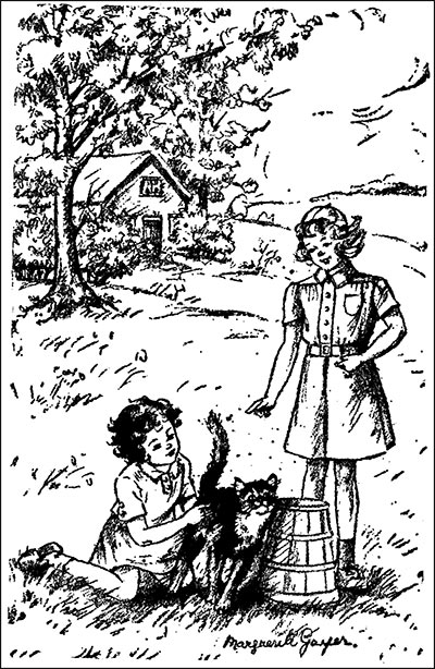 Connie, Veve and Miss Gordon led the way down the street. Directly behind, in orderly file, came Eileen, Jane, Rosemary Fritche and Belinda Matthews. Sunny Davidson carried the big tin can in which the Brownie Scouts planned to cook their outdoor meal.