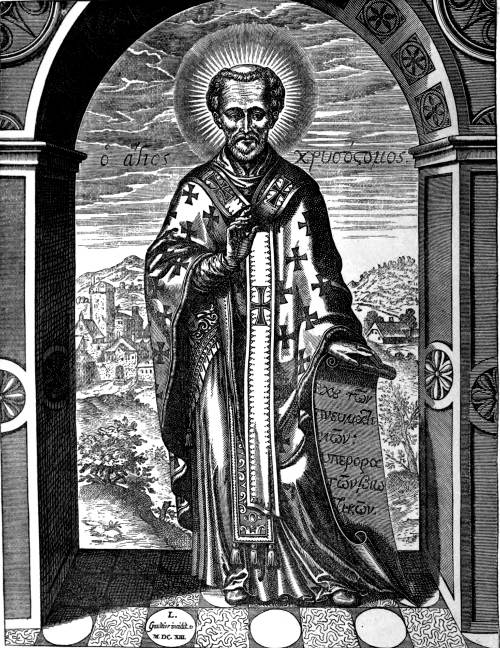 “COPIED FROM A FRONTISPIECE TO THE EDITION BY FRONTO DUCÆUS, A.D. 1636, OF ST. CHRYSOSTOM’S WORKS (IN THE CATHEDRAL LIBRARY, CHICHESTER). THE ORIGINAL IS STATED TO HAVE BEEN ENGRAVED FROM AN EIKON OF GREAT ANTIQUITY, AT CONSTANTINOPLE, AND AGREES WITH THE NOTICES OF CHRYSOSTOM’S APPEARANCE BY GREEK WRITERS, WHO DESCRIBE HIM AS SHORT, WITH A LARGE HEAD, AMPLE, WRINKLED FOREHEAD, EYES DEEP-SET BUT PLEASING, HOLLOW CHEEKS, AND A SCANTY GREY BEARD.”