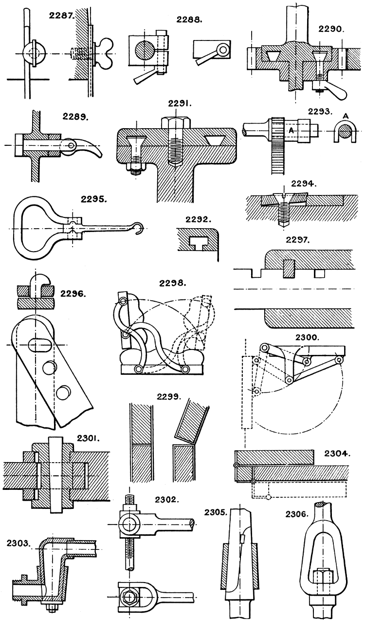 In the course of twenty-five years of such experience, I have found the want of such a volume as the present, and endeavoured to supply the deficiency in my own practice by private notes and sketches, gathered promiscuously, until the difficulty of selection and arrangement became so apparent that I began to classify them, as they exist in the following pages. A few weeks of unusual leisure have enabled me to complete this work and amplify it by numerous additions, and it is now presented in the hope that it will be found of equal service to others engaged in the head-splitting, exhausting work of scheming and devising machinery, than which I can conceive of no head-work more wearing and anxious, Several valuable works have already[vi] found numerous users, and there is no lack of admirable collections of memoranda, rules, and data for designing and proportioning the various constructive details of machinery; but, as far as I am aware, there is no work in existence which aims at the same purpose as is attempted in the following pages, viz. to provide side by side suggestive sketches of the various methods in use for accomplishing any particular mechanical movement or work, in a form easily referred to, and devoid of needless detail and elaboration. A sketch, properly executed, is—to a practical man—worth a folio of description; and it is to such that these pages are addressed. For the same reason it has been deemed undesirable to add to the various sketches any rules or tables relating to strengths or dimensions, which may be found in numerous well-known volumes.