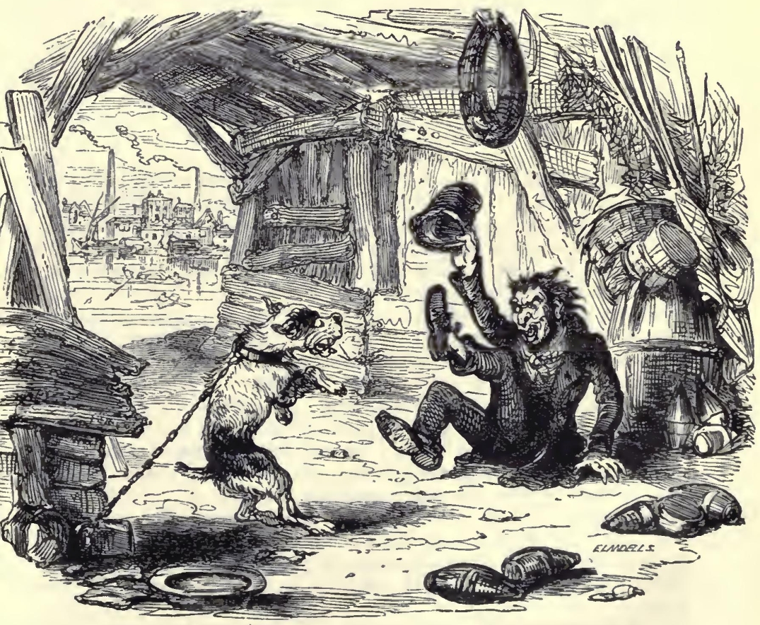 The old man had again relapsed into his former abstraction and took no notice of what passed, but I remarked that when her laugh was over, the child’s bright eyes were dimmed with tears, called forth by the fullness of heart with which she welcomed her uncouth favourite after the little anxiety of the night. As for Kit himself (whose laugh had been all the time one of that sort which very little would change into a cry) he carried a large slice of bread and meat and a mug of beer into a corner, and applied himself to disposing of them with great voracity.