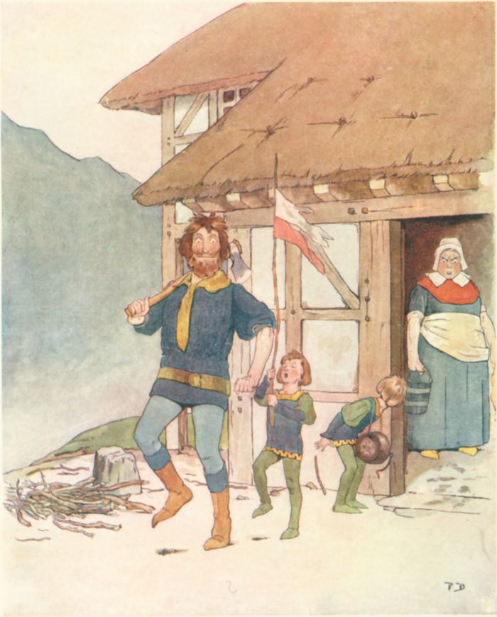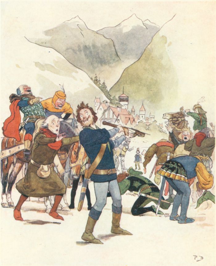 [Transcriber's note: William Tell Told Again is two children's books in one. One is a picture book--16 full-color illustrations by Philip Dadd described in verse by John W. Houghton. The other is a humorous novel by P. G. Wodehouse, based on the picture book. The novel has a lengthier storyline, a more intricate plot, and more characterization. The bound volume intermingled the picture book with the novel, illustrations and poems appearing at regular intervals. Most pictures and verses were distant from the page of the novel that they reflected.