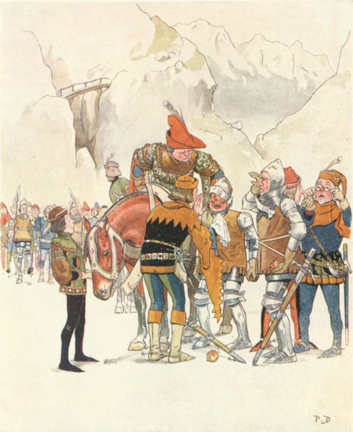One of the first things the Emperor did was to send his friend Hermann Gessler to govern the country. Gessler was not a nice man, and it soon became plain that he would never make himself really popular with the Swiss. The point on which they disagreed in particular was the question of taxes. The Swiss, who were a simple and thrifty people, objected to paying taxes of any sort. They said they wanted to spend their money on all kinds of other things. Gessler, on the other hand, wished to put a tax on everything, and, being Governor, he did it. He made everyone who owned a flock of sheep pay a certain sum of money to him; and if the farmer sold his sheep and bought cows, he had to pay rather more money to Gessler for the cows than he had paid for the sheep. Gessler also taxed bread, and biscuits, and jam, and buns, and lemonade, and, in fact, everything he could think of, till the people of Switzerland determined to complain. They appointed Walter Fürst, who had red hair and looked fierce; Werner Stauffacher, who had gray hair and was always wondering how he ought to pronounce his name; and Arnold of Melchthal, who had light-yellow hair and was supposed to know a great deal about the law, to make the complaint. They called on the Governor one lovely morning in April, and were shown into the Hall of Audience.