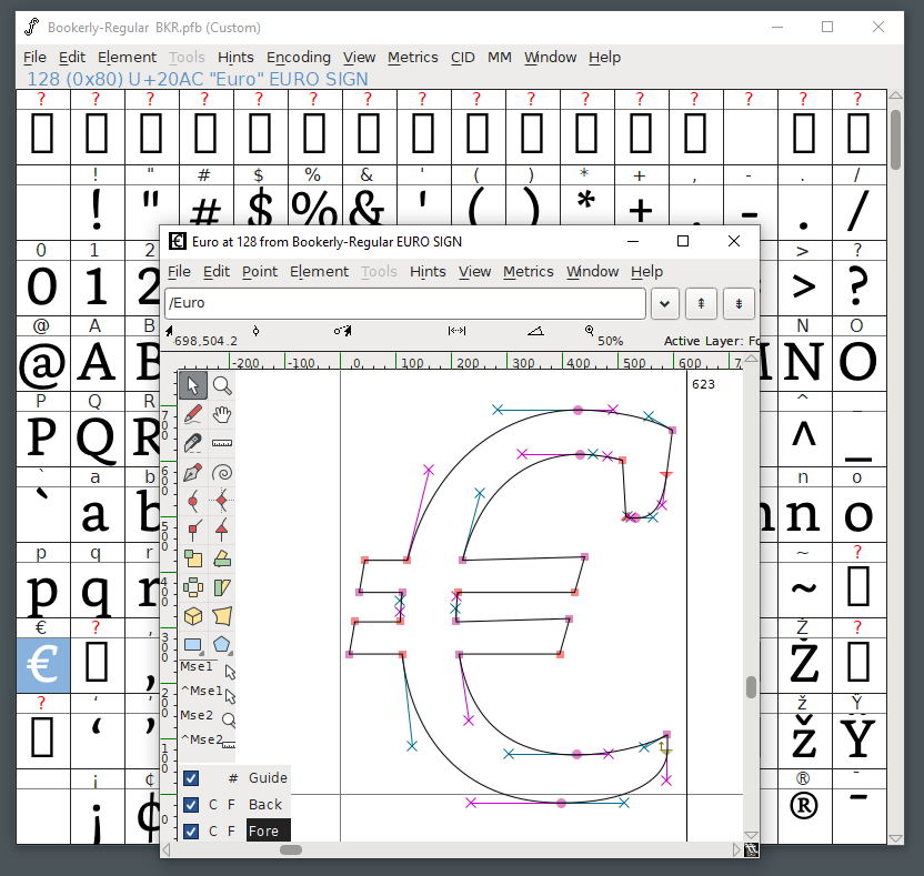 In the field below the top-line menu, note the name of the character (in this example, "/Euro"); the name is case-sensitive, so be careful to note upper- and lower-case characters. This is the glyphname of the character.