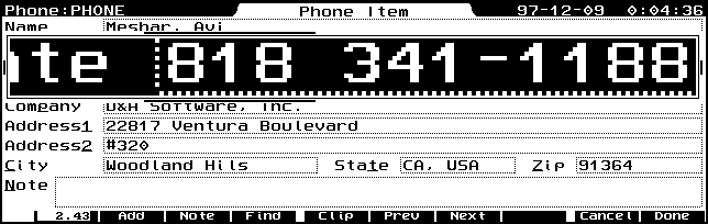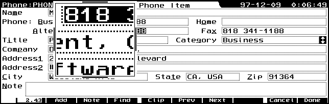 Magnify v 1.50 will magnify a portion of the screen. This can be activated by a hot key (which you may select for yourself). The portion of the screen that is magnified appears in three magnification levels. These magnification levels can be selected by simply pressing the + (plus) key to increase the magnification of the image under the "lense", otr by pressing the - (minus) to reduce the magnification. The images below show maximum magnification, second level, and no magnification. An additional level is not depicted. The images were reduced to accomodate the display, but if you click on each one, a full 640 x 200 pixel (Palmtop full screen) image will load.