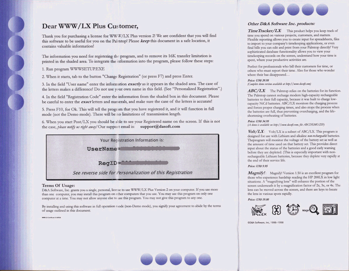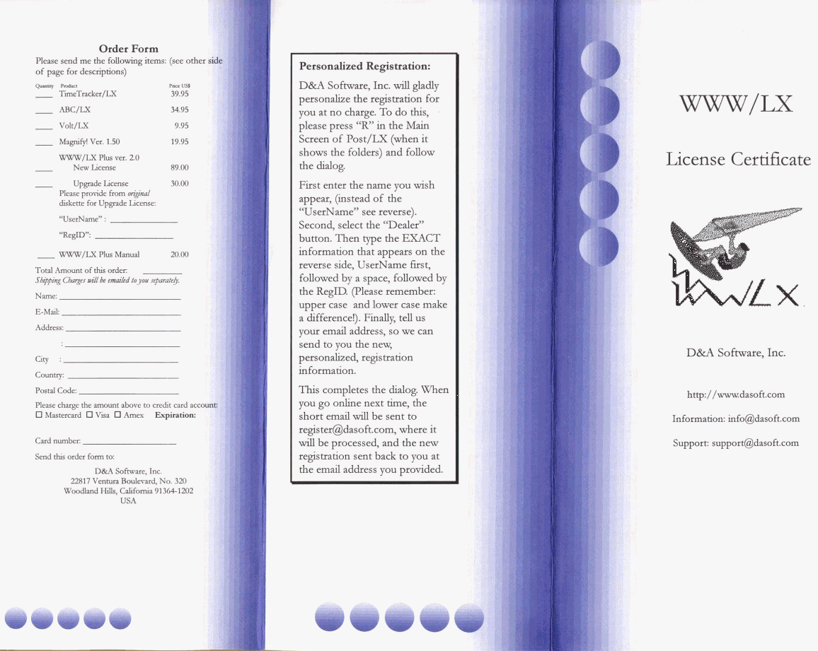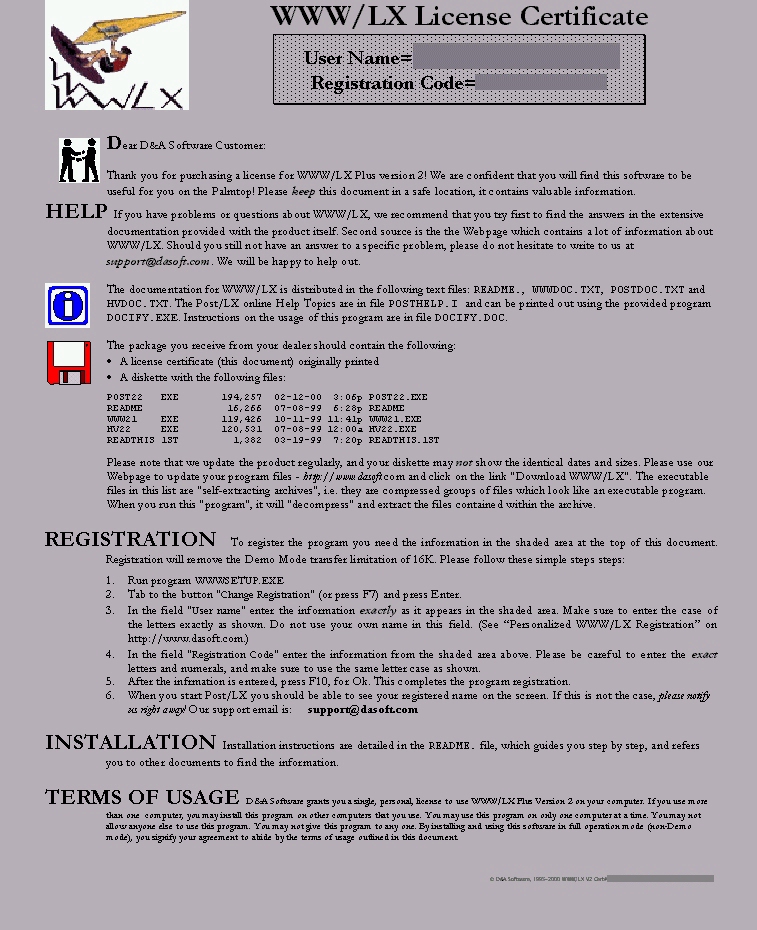 The images below show the LICENSE CERTIFICATE provided to customers who purchase WWW/LX Plus from dealers. It provides you with very valuable information. Please let us know if this is not what you have, or if it looks differently.