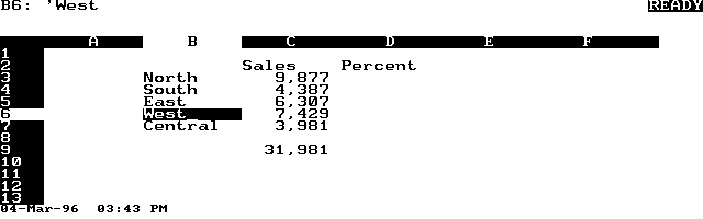 Now we'll construct a simple spreadsheet to demonstrate some absolute and relative cell referencing concepts. First create a new spreadsheet by pressing (MENU) Worksheet Erase Yes. Have it display values in the comma format by pressing (MENU) Worksheet Global Format , (comma) 0 (ENTER). In cells B3 through B7 enter North, South, East, West and Central. In cell C2 enter Sales and in cell D2 enter Percent. Fill in the numbers in C3 through C7 as follows: