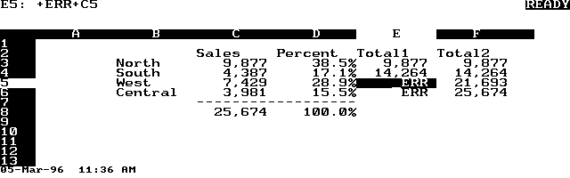 Notice that the formulas in column E below the deleted row "blew up" (they now display error for the cell contents). This is because each formula in column E references the cell just above it (e.g., the formula in cell E3 is +E2+C3, which references cell E2, and so on). When we deleted row 5, we deleted cell E5, and cell E6 became E5. Lotus attempted to move the formula previously in E6 (i.e., +E5+C6) to cell E5, but the +E5 cell reference in the formula no longer made sense. The same was true for E7 moving to E6, but not for the formulas in column F.