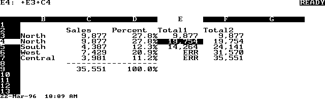 Notice that the figures in the E column don't make sense anymore. The column is supposed to give a running total of the regions, but the running total for the two North and the South regions is less than the total for the two North regions. The running totals in the F column are accurate. The mixed formulas in column F proved to be most flexible under editing circumstances.
