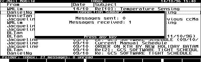 Cc:MAIL Connect screen showing that I had sent 0 messages and