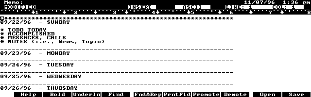 Now try out your template by pressing (Fn) - (Copy). When 1-2-3 responds with Range to copy:, press d (the Range Name we assigned earlier) and then (ENTER). Then press the Memo key, and assuming you are in a new document press (Fn) - (Paste). You should see a weeks worth of formatted Memo set up for your use. (See screen below. You may have to adjust the margins in Memo to display the journal template properly.)