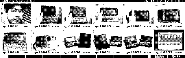 QVCom is a software utility for the Palmtop that lets you transfer the picture images between the QV-10 and the 100/200LX, connected together by a serial cable. With QVCom running on the Palmtop you can view thumbnail images of the pictures stored in the camera, select the desired images and transfer them to the Palmtop in one simple operation (see screen, top of next page). QVCom is not shareware or freeware, but "photoware." Try it out free of charge to see if you like it. If you decide to continue using it, send a photograph you've taken with your QV-10 to QVCom's author, Brahma.