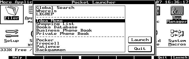 MoreEXM also has a function that suppresses the clearing of the previous screen when you start an EXM program. This function gives software developers an easy way to make a program pop up on top of another application. Take a look at Pocket Launcher and 123g (described below) to see how this feature is utilized.