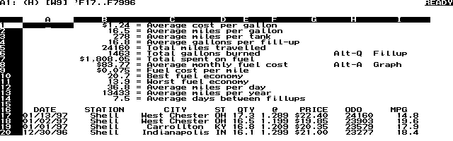 This Lotus spreadsheet keeps track of fuel costs, miles driven