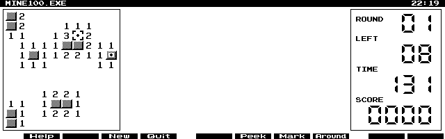 Finally, built-in to the HP 200LX and HP 95LX and available for the HP 100LX is Hearts and Bones (HBUS.ZIP) n. Windows users might be familiar with a similar game, Minesweeper. Another game of logic, the idea is to deduce where the mines are on a matrix of squares. Mine100 n (see Screen 3) is different enough from Hearts & Bones (there is a timer, for instance) that H&B fans might want to give it a try.