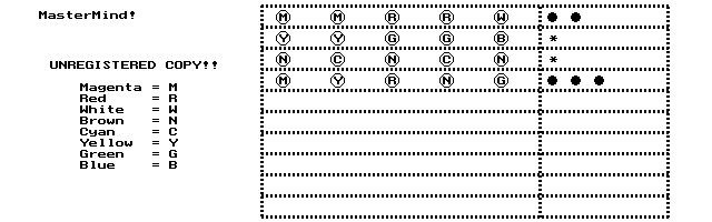Mastermind (MasterHP n) was written for the Palmtop and is a simple, straightforward implementation of MasterMindTM (see Screen 2). It is a game of pure logical deduction. The computer selects at random from a group of five colors. Your job is to determine which color is in each position in as few guesses as possible. After each guess, the computer tells you how many correct colors and how many in correct position.