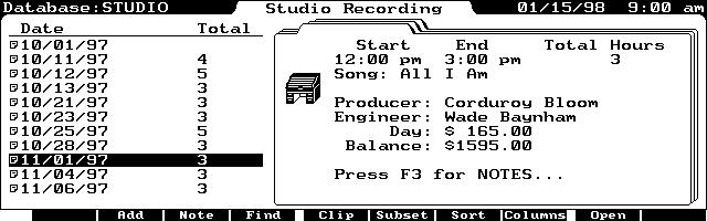 With my palmtop with me in the studio, I can easily review this information and enter new data. My palmtop quickly shows me how much time and money is needed, and what has to be done during the next recording session. This provides a well-organized plan for keeping each recording session running smoothly and spending the least amount of money, but getting the most quality out of the time spent.