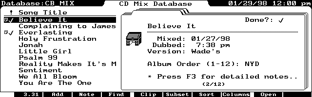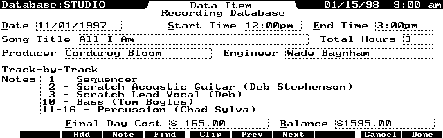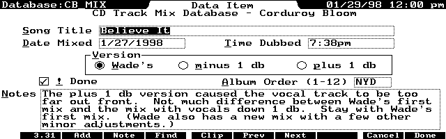 For example, I need to know the date the song was mixed, and what time it was dubbed to a stereo cassette. The database also tells me the order in which all the songs were mixed when they are all finished. Additionally, I can tell if an individual song was mixed during the day, or in the evening.