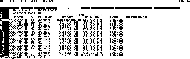 TIMELOGR has some handy sorting capabilities. Chief among them is the data in column C which is used to categorize the session by client, project, etc. If I'm keeping a timesheet for the day, I press ALT-C to get the day's totals for each category.