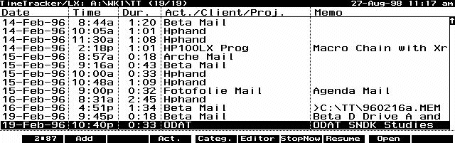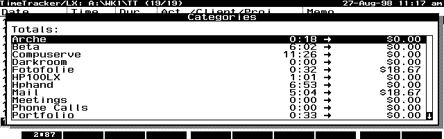 The little conveniences that TIMETRACKER/LX provides, has made an otherwise tedious exercise more bearable and even at times enjoyable. I find myself wondering, how much time do I really spend doing "office-organizing." All I need to do with TIMETRACKER/LX, is to add another Activity: simply select Edit Activities (F4) then F2 (Add), enter the name, associate any categories, edit the hourly rate, and press F10 when done. The Activity type is now always available.