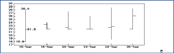 In the graph, the end points of the vertical lines represent the High and Low points for the data. The small horizontal lines that branch off the vertical lines stand for the Close and Open price of a stock or commodity. Note that in the above chart the Low and Open prices are the same for the first day.
