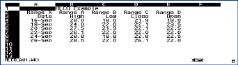 Then press MENU and select the Graph Type option and select the HLCO type of graph. Set the following ranges by pressing the F2 (Edit) key and pressing the TAB key until the X: range is highlighted. At this point you'll be able to key in the X range, A4..A9. Then press the TAB key and enter the B: range, B4..B9. Fill in the C:, D:, and E: ranges with C4..C9, D4..D9, E4..E9 respectively. Press TAB to get to the Orientation line and press the space bar when the Vertical label is highlighted. Select the Options Data-label from the menu and fill in the Data labels as A: [B4..B4], B:[C4..C4], C:[D4..D4], D:[E4..E4] and set the Alignment to A: Above, B: Left, C: Right, D: Left. Now press F10 (Graph) to see what you have created. My graph looks like the one in Screen 2.